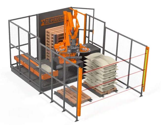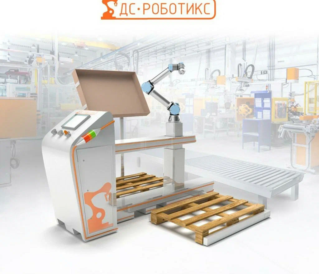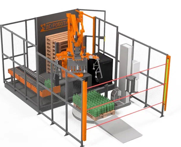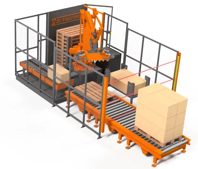 Так, «ДС-Роботикс» разработала и активно внедряет серийное решение - Роботизированный Укладчик Паллет (РУП). Это модульная система, которая состоит из ячейки с промышленным роботом-паллетайзером (имеет 4 степени свободы движения, грузоподъемность до 130 кг и радиус действия до 3,0 м.) с пультом управления, компактного 6 или 8 – осевого шкафа управления линией, магазина паллет (в него загружается стопка паллет для дальнейшей автоматической выдачи роботом на линию), прив`одного роликового конвейера для перемещения паллет из безопасной зоны в рабочую область и наоборот (причем возможен их подъем под углом до 5 градусов), и системы безопасности.
